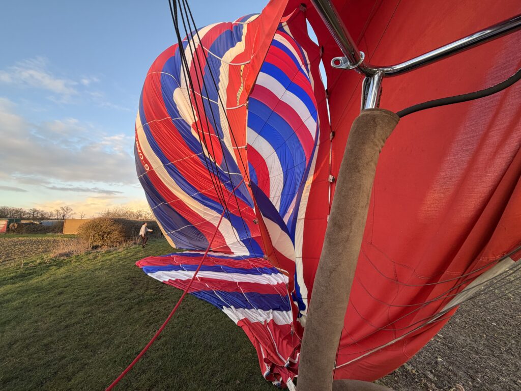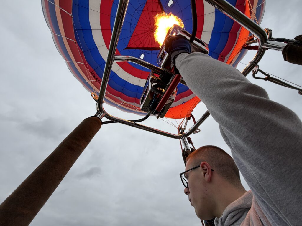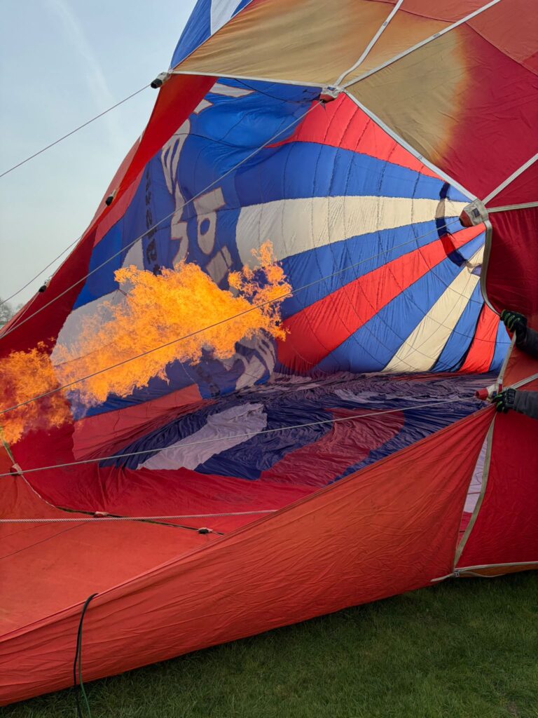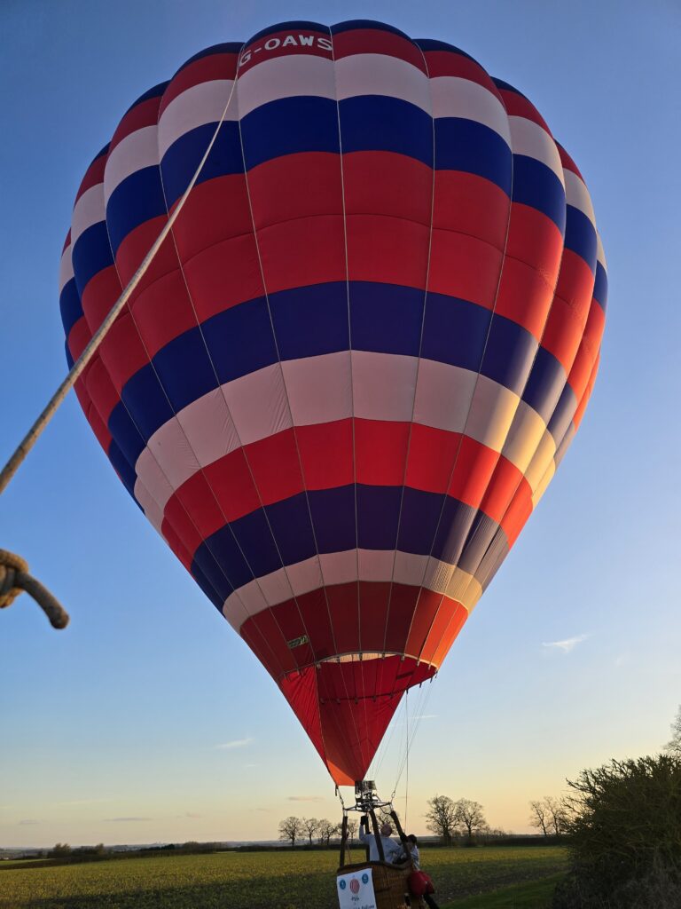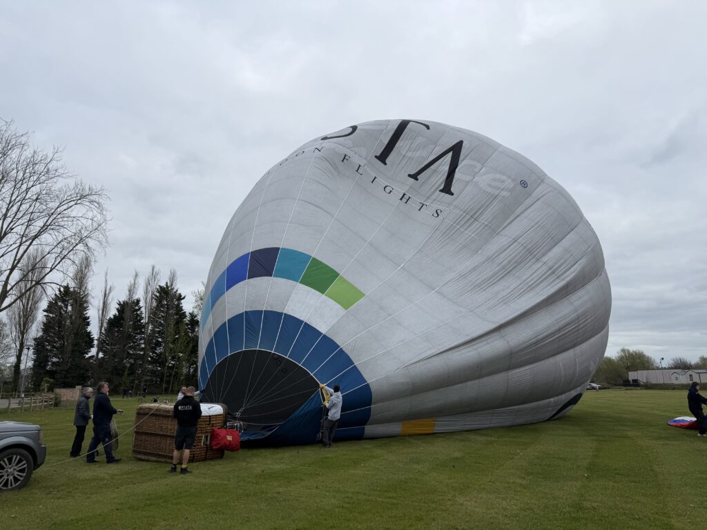 Liam wasn’t phased by this and made sure all his checks were done and that everyone was safe. Jamie also went over emergency situations and practiced pilot light failures on the ground. Liam then inflated the balloon and prepared for take-off whilst managing the effects of the gusts on the balloon and ensuring he wasn’t experiencing false lift. False lift is caused when wind flowing over the top of the balloon creates temporary lower pressure and thus generating extra lift. The problem is this disappears rather quickly and if you misjudge it, you will find yourself headed rapidly back down to Earth . Thankfully, Liam didn’t misjudge it, and the balloon was soon safely airborne.