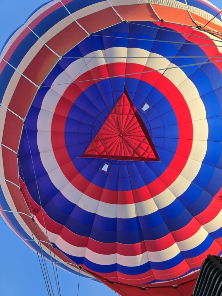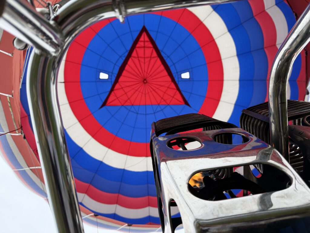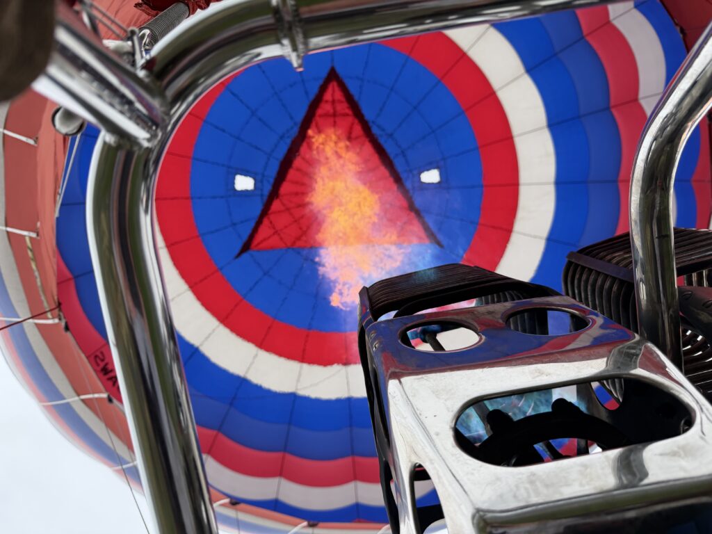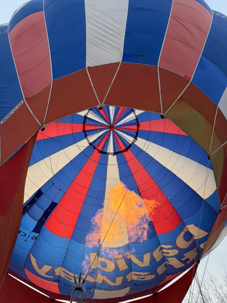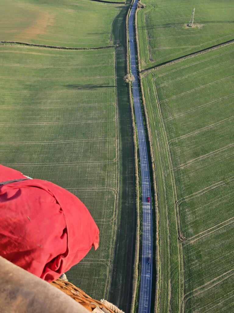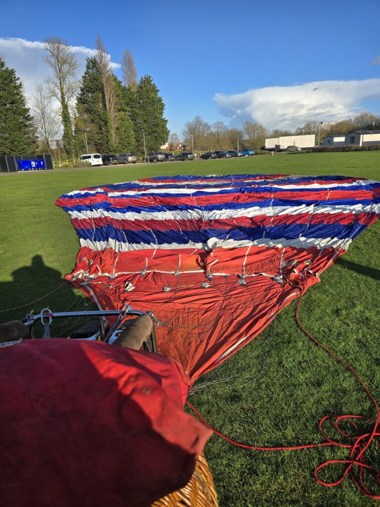 Liam wasn’t phased by this and made sure all his checks were done and that everyone was safe. Jamie also went over emergency situations and practiced pilot light failures on the ground. Liam then inflated the balloon and prepared for take-off whilst managing the effects of the gusts on the balloon and ensuring he wasn’t experiencing false lift. False lift is caused when wind flowing over the top of the balloon creates temporary lower pressure and thus generating extra lift. The problem is this disappears rather quickly and if you misjudge it, you will find yourself headed rapidly back down to Earth . Thankfully, Liam didn’t misjudge it, and the balloon was soon safely airborne.