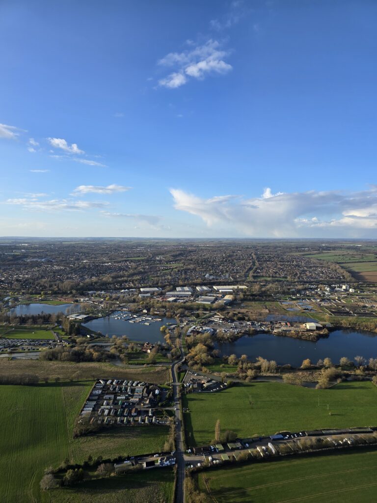 One of our primary goals this year is to get our trainee Liam Menzies through the final stages of his license. However, it’s also important that the person teaching him has also blown off the winter cobwebs too. So, for the first flight Liam and Jamie flew together with Jamie planning to do the whole flight. At the time many of the fields in Northamptonshire were still very wet. Our launch site at Billing Aquadrome was thankfully dry.