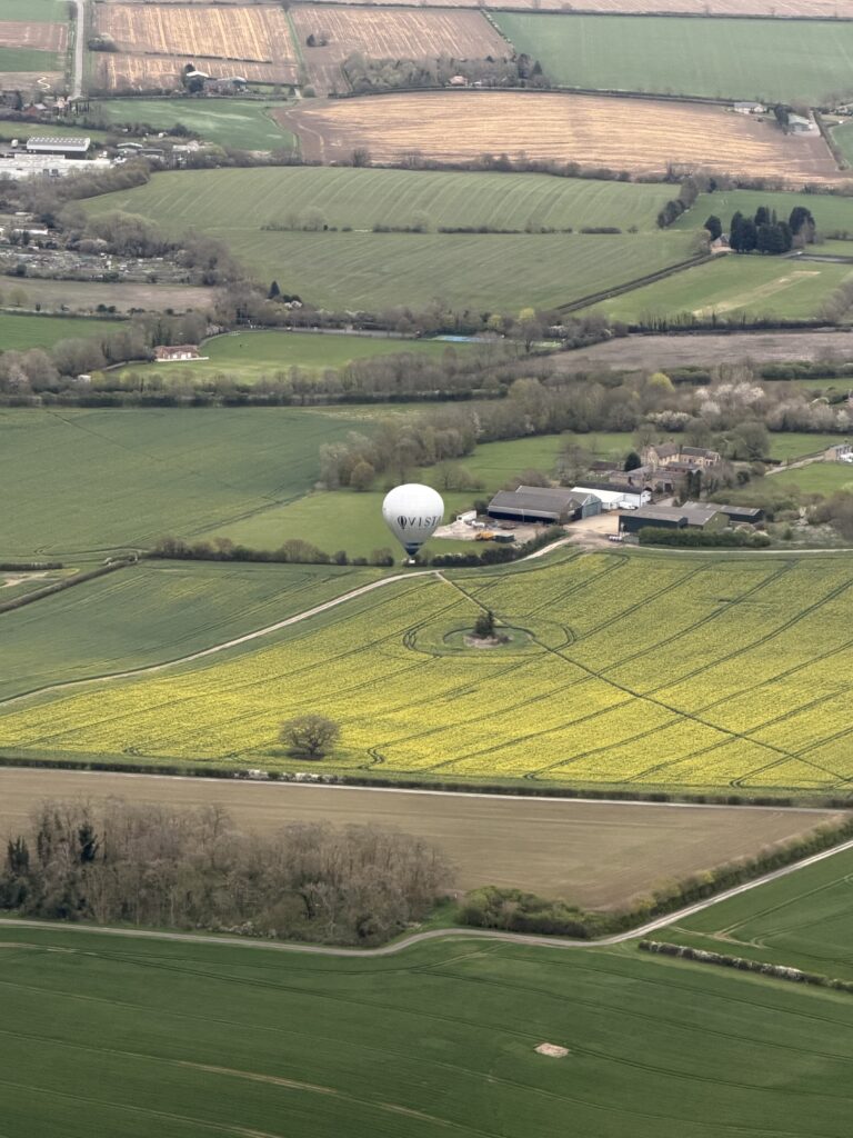 After half an hour in the air what seemed like a really good field in Yardley Hastings came up and Jamie landed the balloon there. However, it became clear that the adjoining field was flooded and access was poor. The most sensible thing to do was to fly on! Rather than waste and opportunity, Jamie let Liam take over to have a training flight.